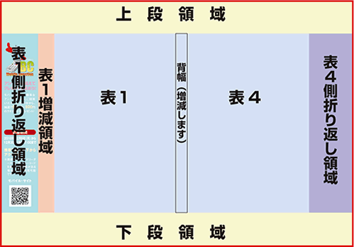 - 表1側折り返し領域・表4側折り返し領域は、本に巻かれた時に内側に折り込まれる領域です。